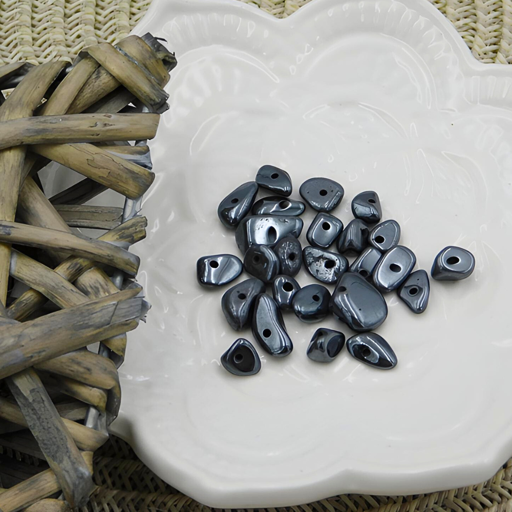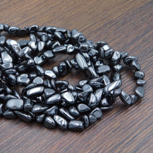 Nieregularne, drobne kamyczki tzw. sieczka wykonane z hematytu w metalicznym, grafitowym kolorze. Ich naturalnie nieregularny kształt i rozmiar (od 3mm do 6mm) dodają biżuterii organicznego i surowego charakteru. Hematyt sieczka ma wiele zastosowań w biżuterii, umożliwiając wykonanie unikatowych kolczyków naszyjników oraz oryginalnych koralików do bransoletek.