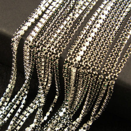 Taśma metalowa srebrna 2mm z cyrkoniami ciemno zielonymi (20cm)