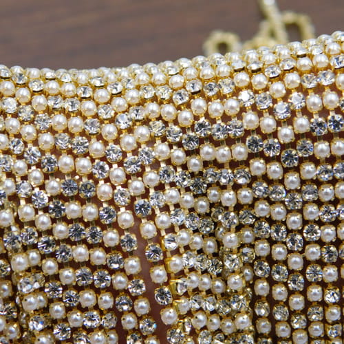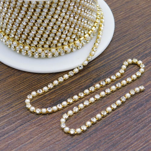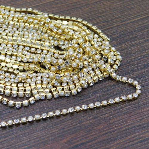 Taśma metalowa złota 2mm z cyrkoniami przezroczystymi i białymi perełkami (20cm)