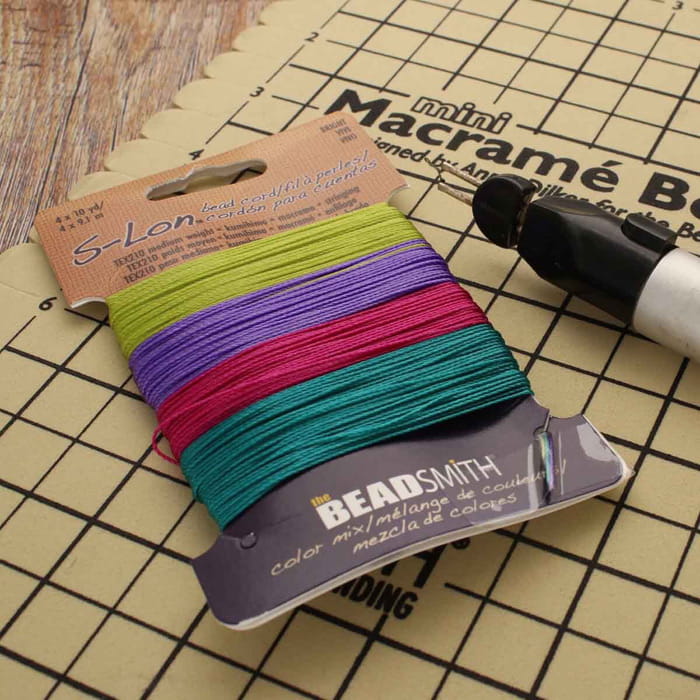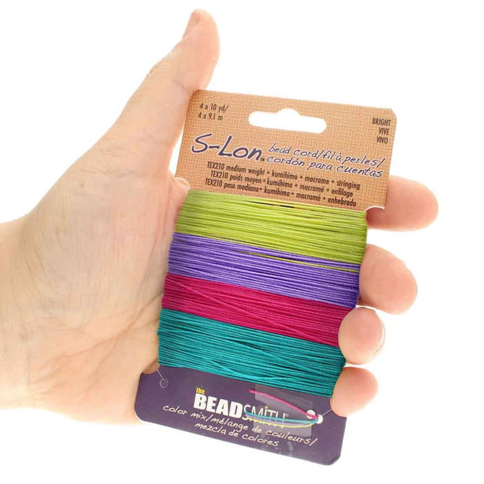 Opis produktu:S-Lon MIX to trzywarstwowe, skręcone nici nylonowe o grubości Tex210 - około 0.5mm. Są bardzo mocne, wytrzymałe i gładkie. Aby zapobiec rozdwajaniu nici końcówki można przypalać. Przeznaczone do kul 6, 8mm lub innych drobnych koralików (np. Toho 11/0, 8/0 czy 6/0) ze średnicą otworu większą niż 0.8mm. Polecamy też do kumihimo, mikro makramy oraz do nawlekania kamieni. W opakowaniu mix 4 kolorów nici po około 9,14m widocznych na zdjęciu. Wyprodukowane w USA dla BeadSmith.