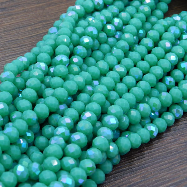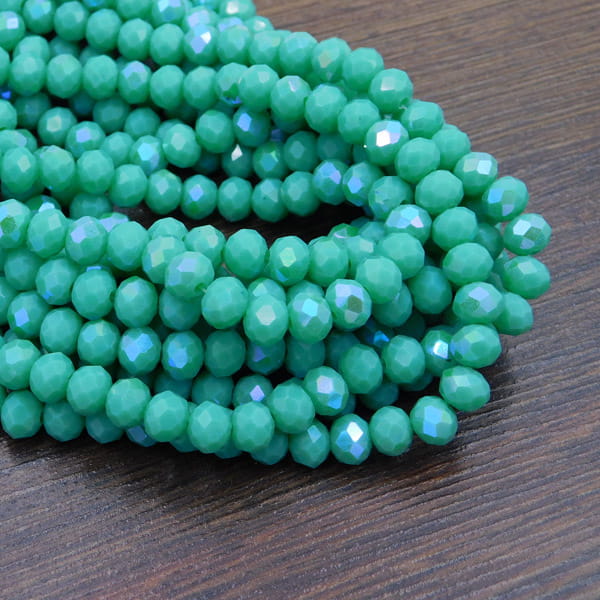 Wyraziste koraliki szklane o kształcie oponki i średnicy 6mm. Koraliki są intensywnie fasetowane, co potęguje ich blask przy każdym ruchu. Ich bazowy kolor to piękna zieleń morska, która została wzbogacona o opalizującą powłokę AB. Powłoka AB nadaje im wielobarwny połysk, mieniący się subtelnymi odcieniami. Dzięki rozmiarowi 6mm x 4.5mm są świetne do projektów Handmade w stylu Boho, Wakacyjnym oraz jako dominujący element w delikatnych bransoletkach DIY.