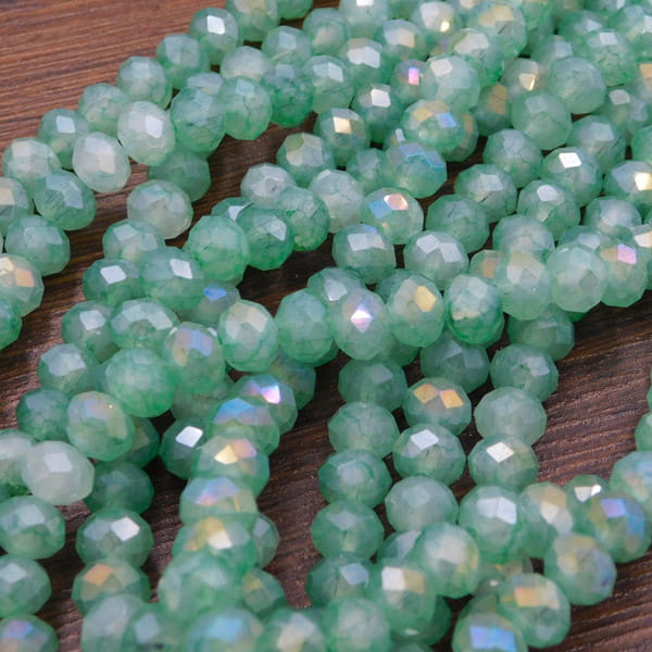 Wyjątkowe oponki z cieniowanego szkła, które dzięki fasetowanej powierzchni i powłoce Aurora Borealis (AB) tworzą na biżuterii wielobarwne refleksy. Kolor przechodzi przez różne odcienie zieleni, co pozwala na tworzenie ciekawych przejść tonalnych w projektach Handmade. Precyzyjny szlif zapewnia wyraźny błysk, który ożywi każdą kompozycję.
