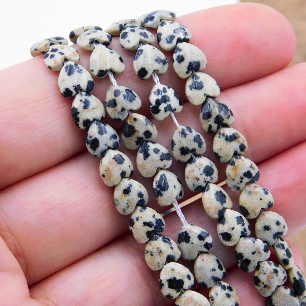- Pielęgnacja i właściwości kamieni: Jaspis dalmatyńczyk to minerał stworzony przez naturę, dlatego każde serce wyróżnia się zupełnie unikalnym rozmieszczeniem plamek. Z racji specyfiki obróbki mechanicznej i wiercenia tak małych brył, na kamieniach mogą pojawiać się mikrowykruszenia widoczne bezpośrednio przy otworach, co jest całkowicie normalnym zjawiskiem. Aby zachować idealny wygląd projektów, chroń je przed chemią gospodarczą i wilgocią. Gotowe wyroby przechowuj w zamkniętych kasetkach.
