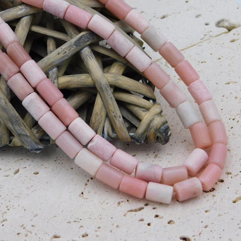 Pudrowy opal różowy w formie walca to fantastyczny materiał na luksusową biżuterię na nici. Nawlecz kolumny na naturalne nici jedwabne, tworząc niezwykle elegancką i miękko układającą się bransoletkę. Aby zniwelować tarcie między kamieniami i nadać całości nowoczesnego rytmu, rozdziel poszczególne wałki przy pomocy drobnych koralików Toho w odcieniu metalicznego złota. Jeśli planujesz stworzyć wyrafinowany naszyjnik, świetnym pomysłem będzie użycie gładkich przekładek ze stali chirurgicznej, które pięknie wyeksponują wydłużony kształt opalu. Taka autorska biżuteria z pewnością przyciągnie spojrzenia i podkreśli klasę każdego stroju.